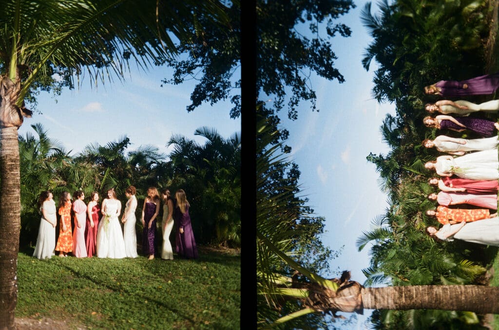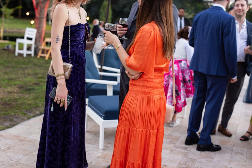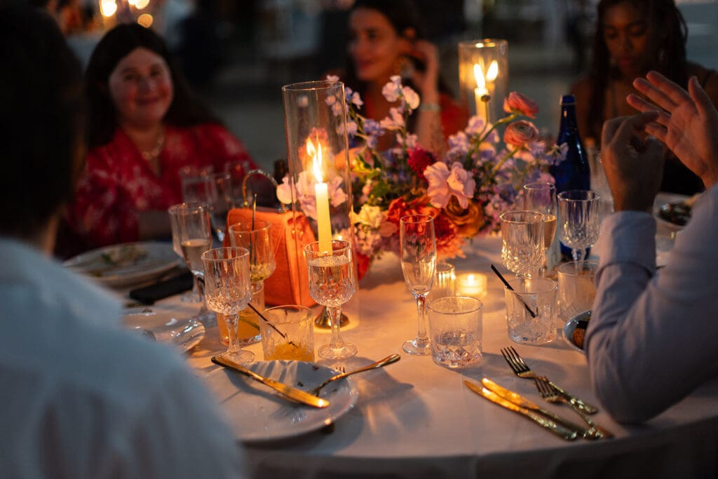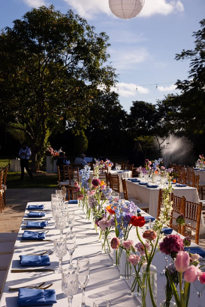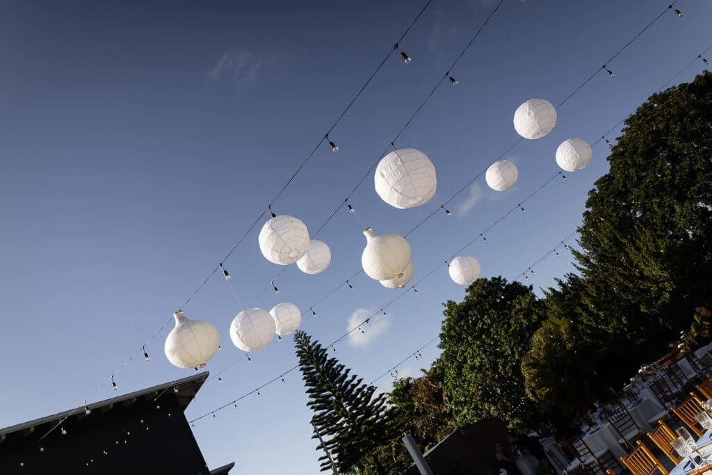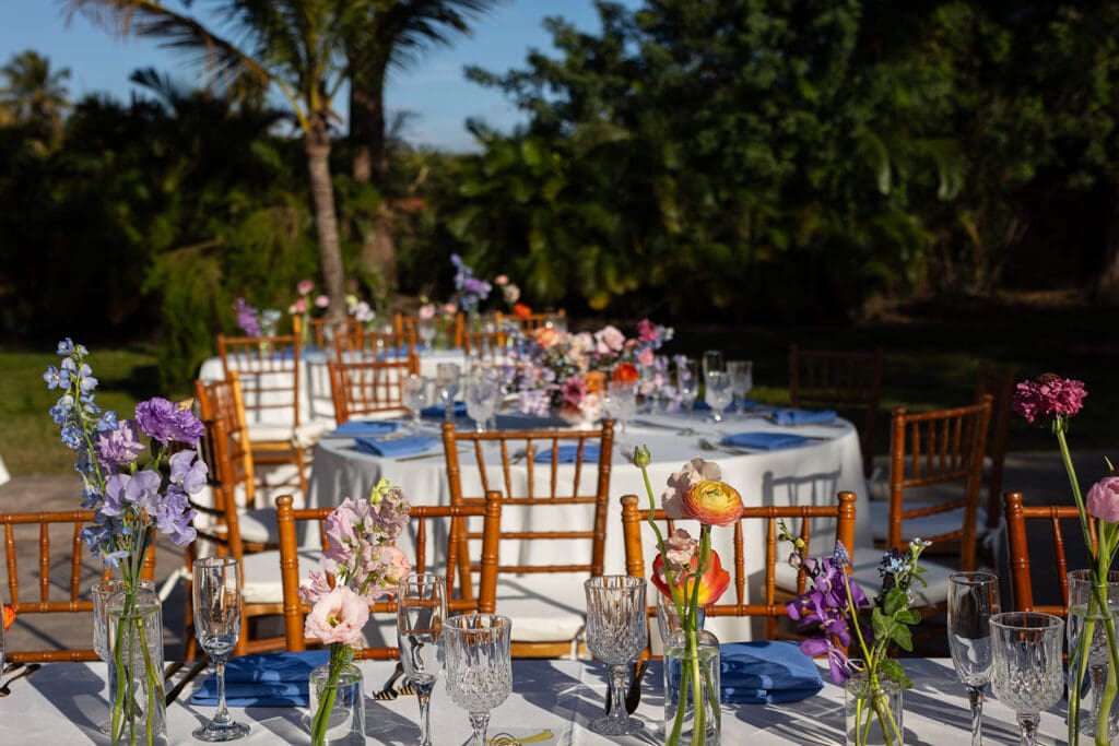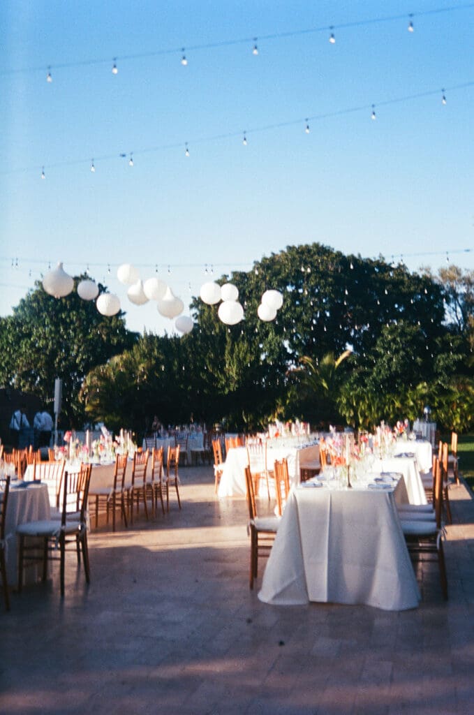 This wedding wasn’t about trends. It was about them. She wanted paper lanterns and string lights overhead (“non-negotiable”) and a layout that didn’t feel too structured. So we layered intention underneath every detail: classic wood chairs, ivory linens, clean lines, and then let the color—florals, mismatched dresses, that glowing Miami sky—do all the talking.